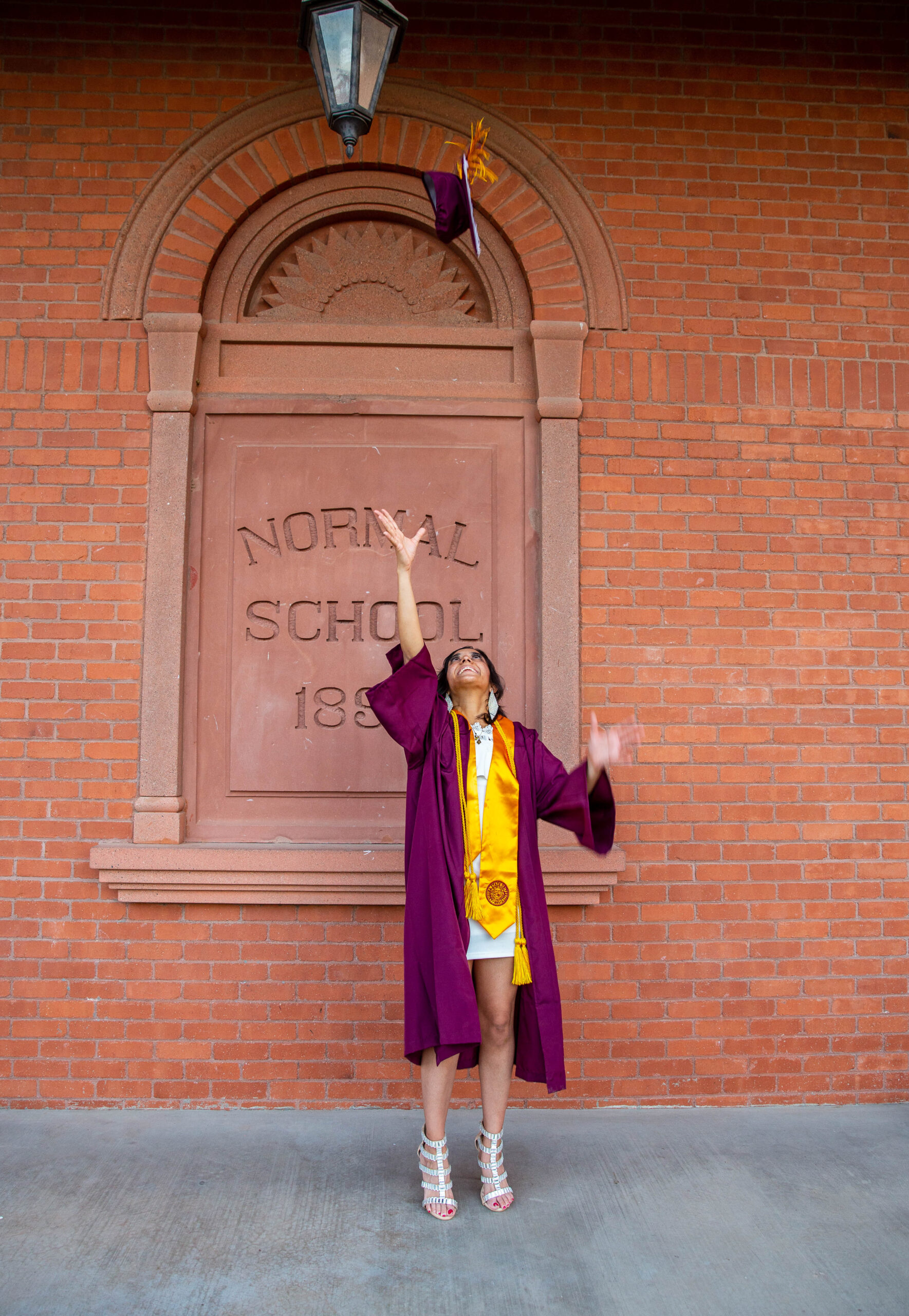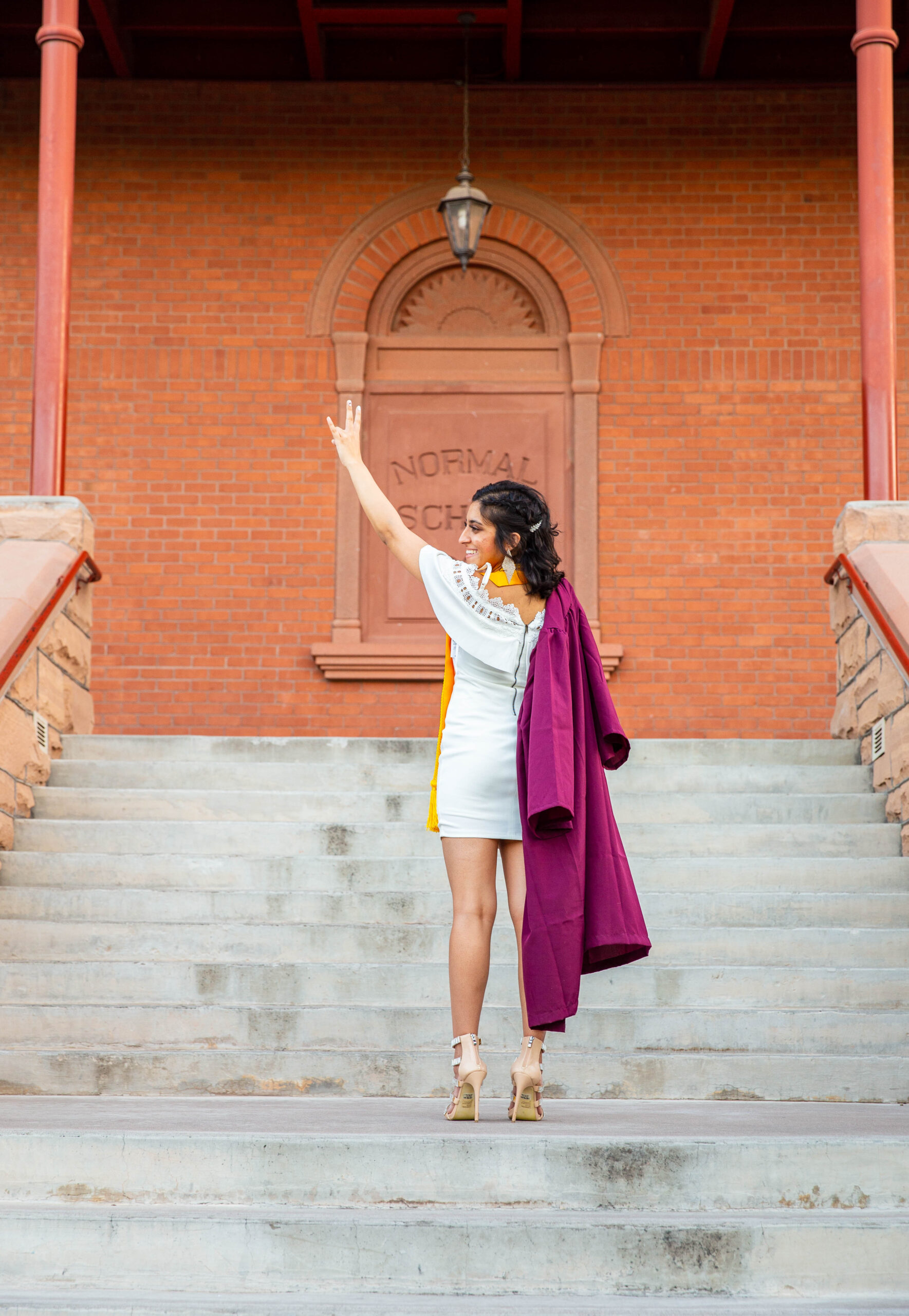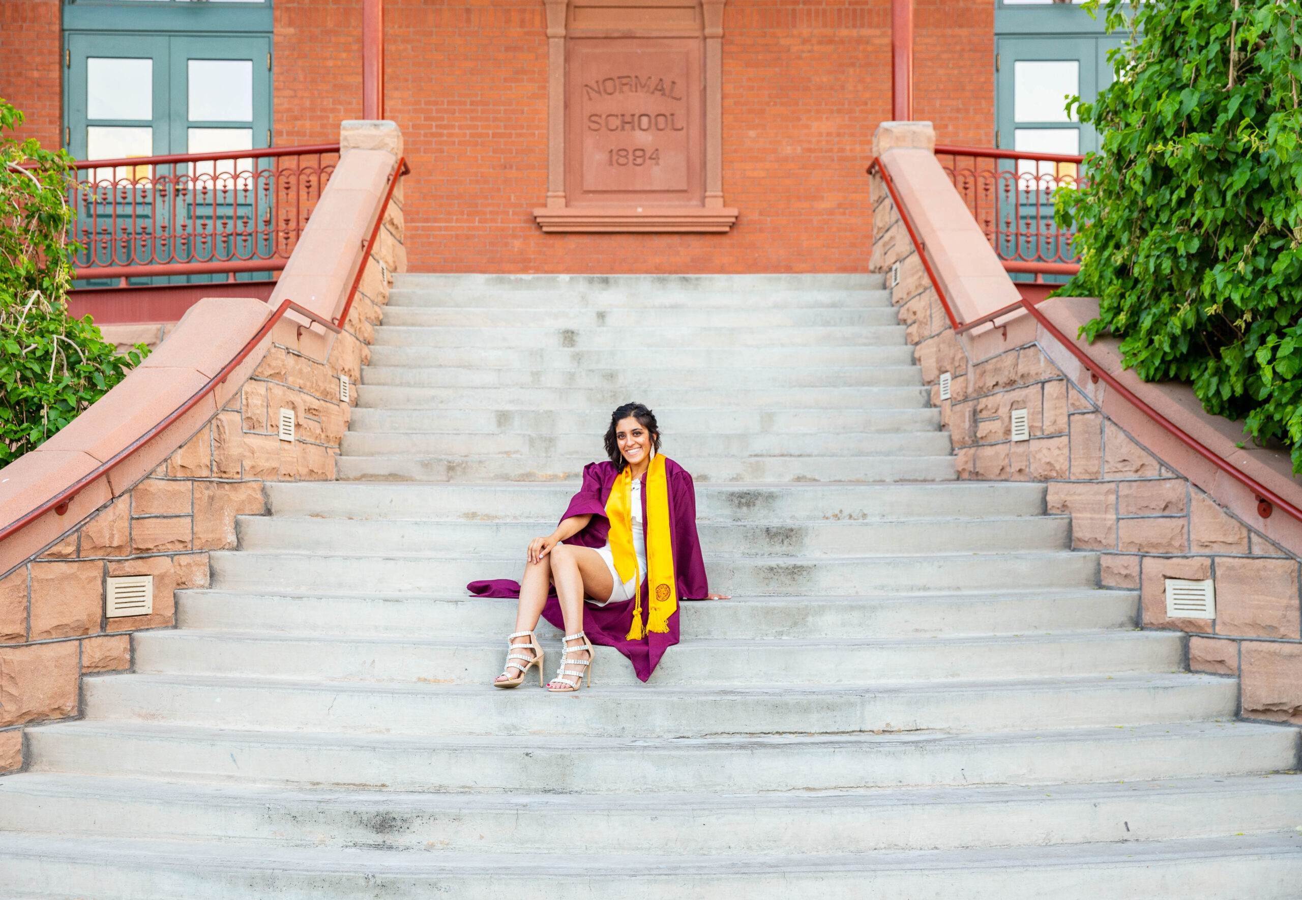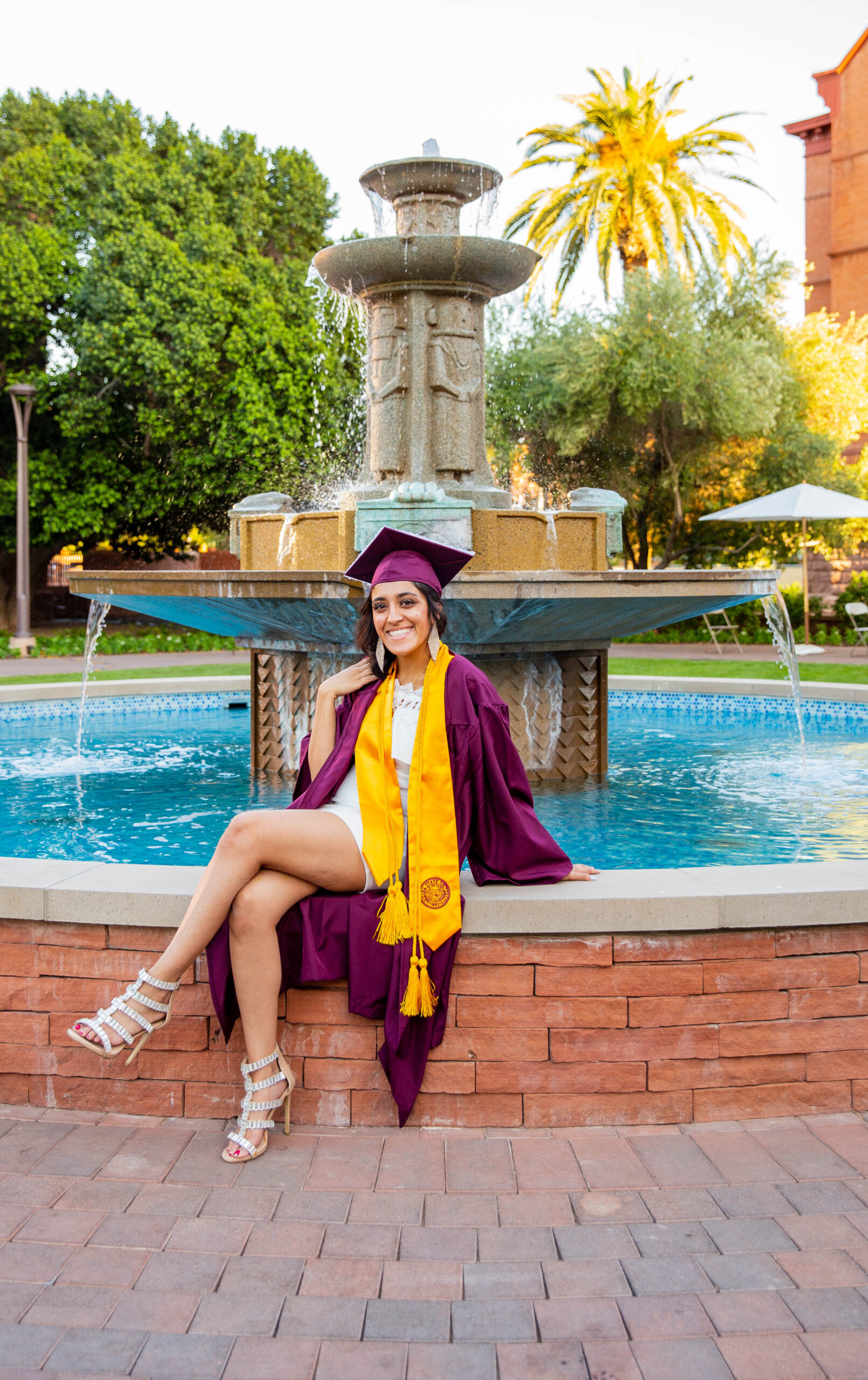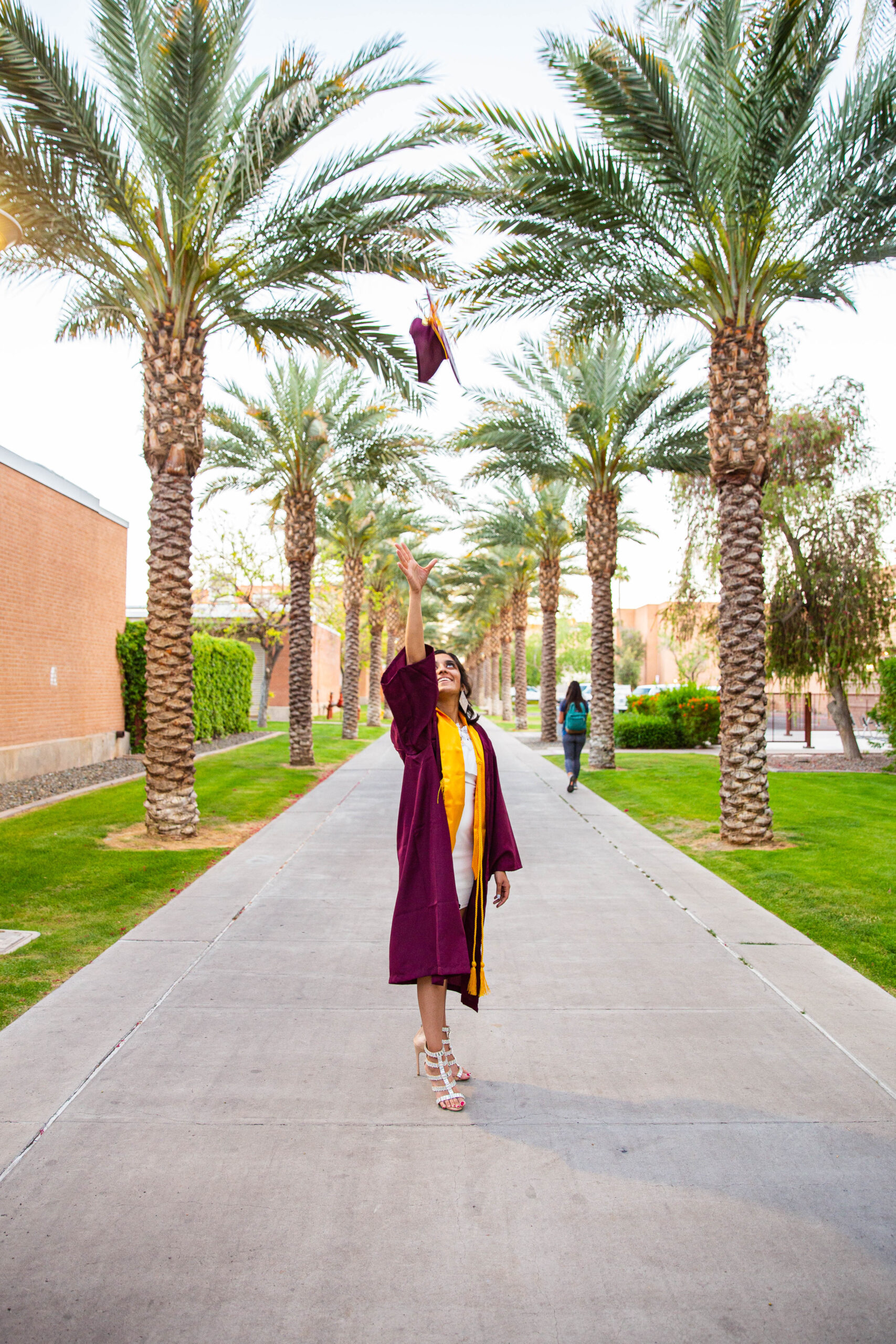 When you’re planning your ASU senior photos, you definitely want to include some of the popular and iconic locations on campus such as Old Main, and the Palm Walk. Quick note: since these locations are so popular, it can take some time to get the shots, so make sure you plan enough time (esp. as it gets closer to graduation time). With so man other students doing their sessions, it really adds to the vibe and you can feel the excitement in the air as seniors pop bottles of champagne, yell in excitement, and throw up their forks.